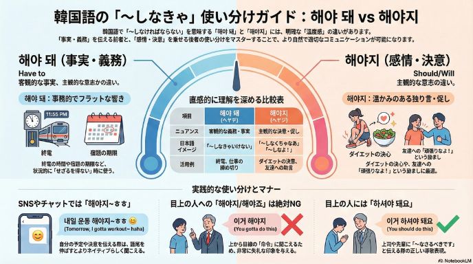 韓国語学習者が「〜しなければならない」と習うと、一番最初に出てくるのが「해야 돼(ヘヤデ)」です。韓国語文法解説サイトなどでも説明されている通り、「해야 돼」は状況的にそうせざるを得ない客観的な事実や義務を表す基本形です。どんな場面でも使える万能な言葉ですが、少し「平坦」で「事務的」な響きになることがあります。